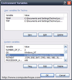 Path حالا توسط ویندوز 2000 و ویندوز XPمدیریت شده و فایلهای autoexec.bat و autoexec.nt در نسخه های قبلی ویندوز وجود نداشتند. برای تغییر متغیرهای محیطی سیستم مراحل زیر را انجام دهید: