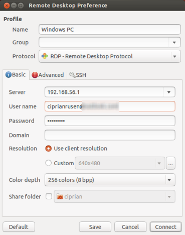 سپس در تب Basic آدرس IP کامپیوتر ویندوزی را در فیلد Server تایپ کنید. سپس username و password که می خواهید برای اتصال به کامپیوتر ویندوزی استفاده کنید تایپ کنید. حواستون باشه که user باید روی کامپیوت ویندوزی وجود داشته باشه. اگر شما از اکانت مایکروسافت روی ویندوز 8 استفاده می کنید کافی است که ایمیل و پسورد را وارد کنید.