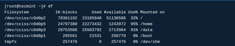 دستور df اطلاعات نام درایو، مجموع بالک ها، مجموع فضای دیسک، فضای استفاده شده دیسک، فضای دیسک در دسترس و نقاطی از سیستم فایل که روی آن ها درایو ها mount شده اند را نشان می دهد.